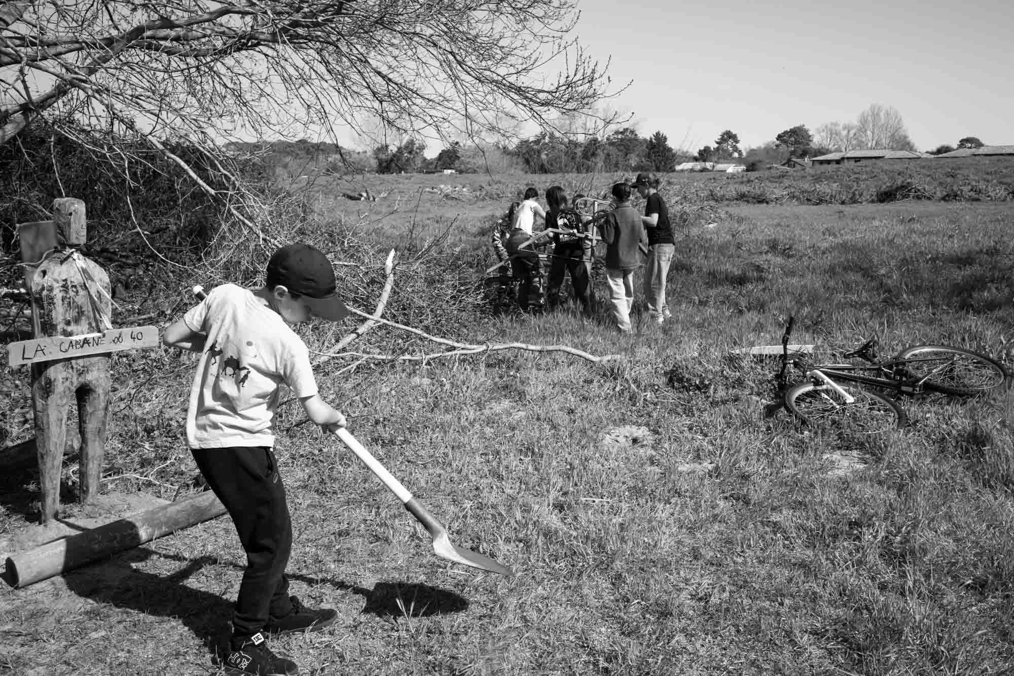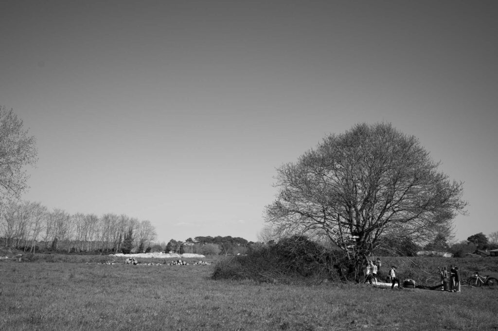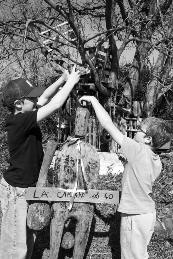 En traversant le champ, j’entends des cris d’enfants. J’aperçois un groupe qui ramène un porte-vélo récupéré à la déchetterie. Ils ont mutualisé leurs forces. Comme des fourmis.