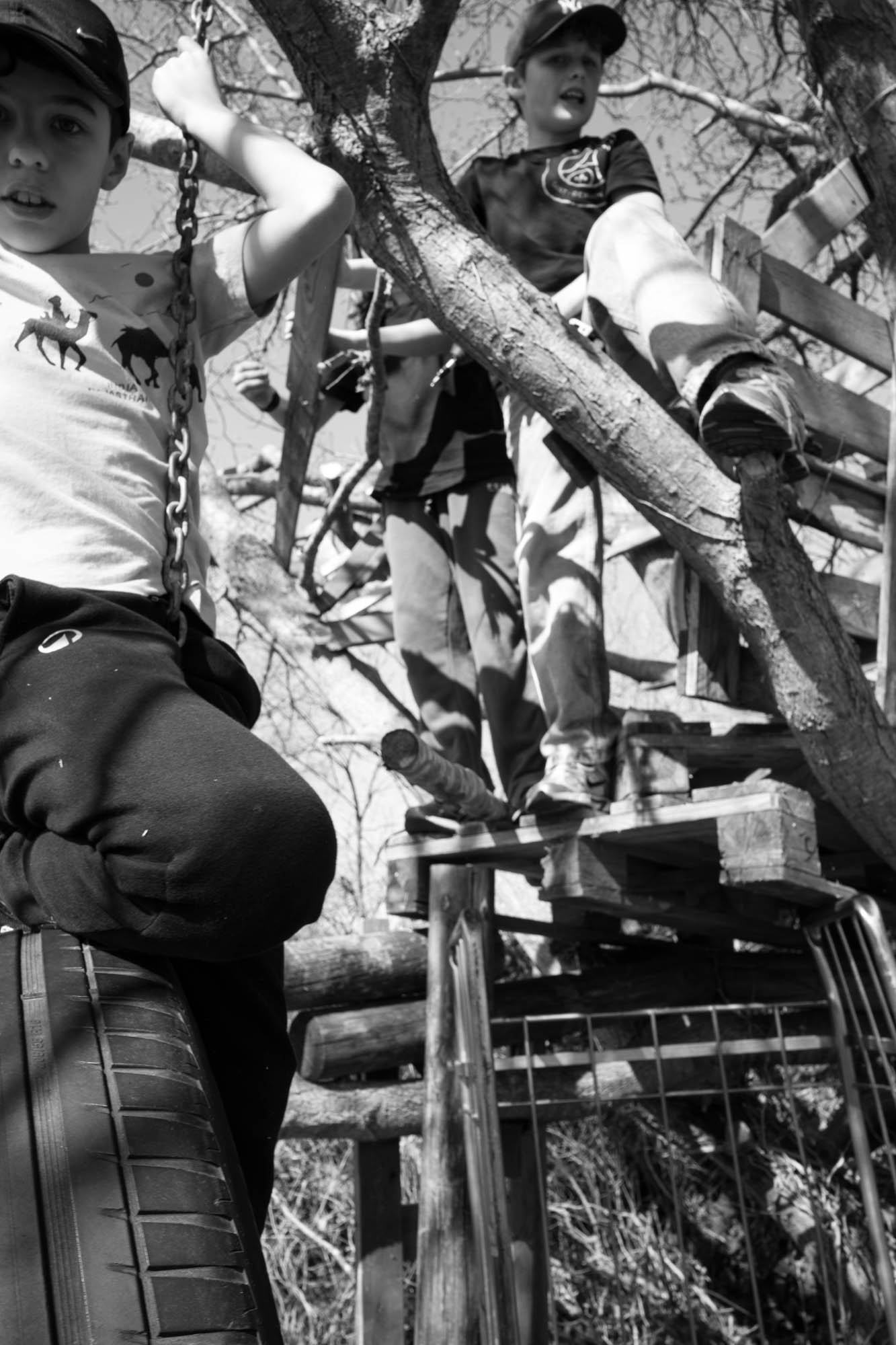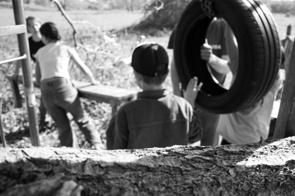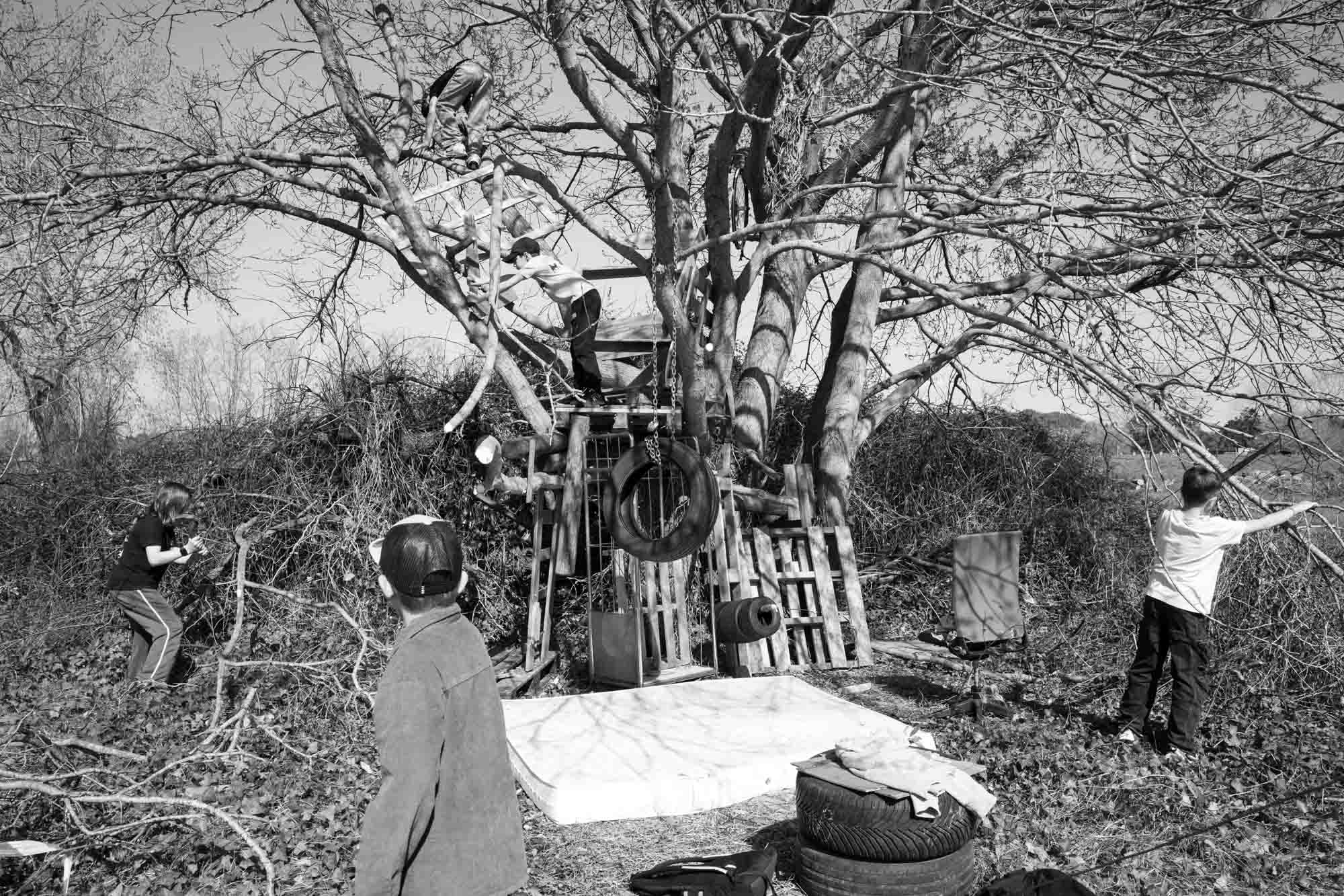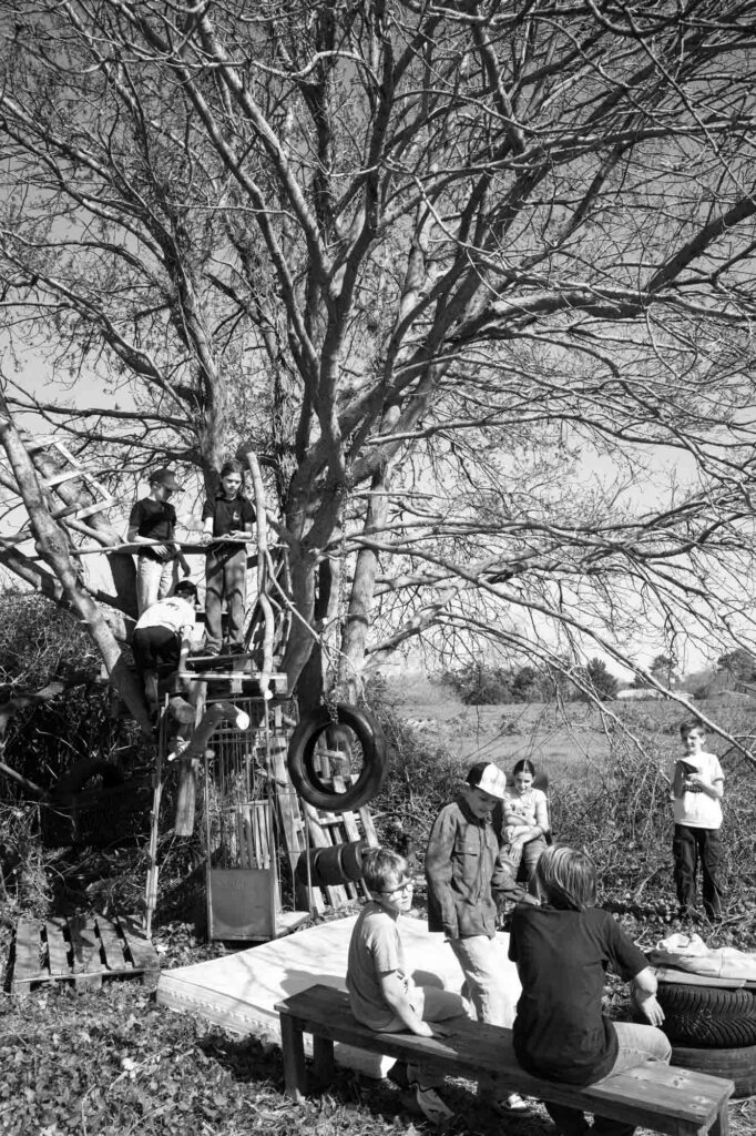 La cabane est en construction. Un étage est déjà posé. Des balançoires bricolées avec des pneus de camion sont en place.