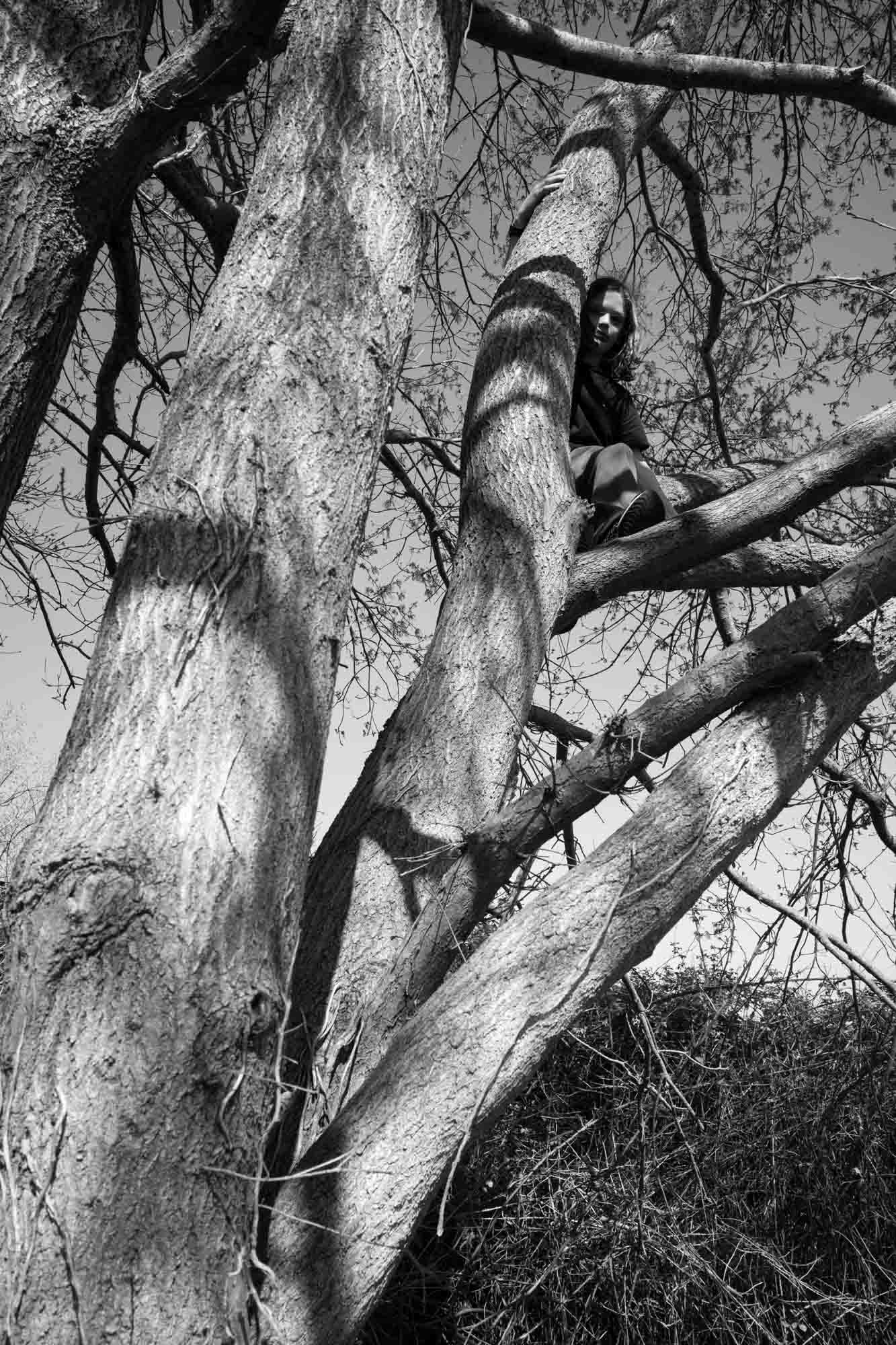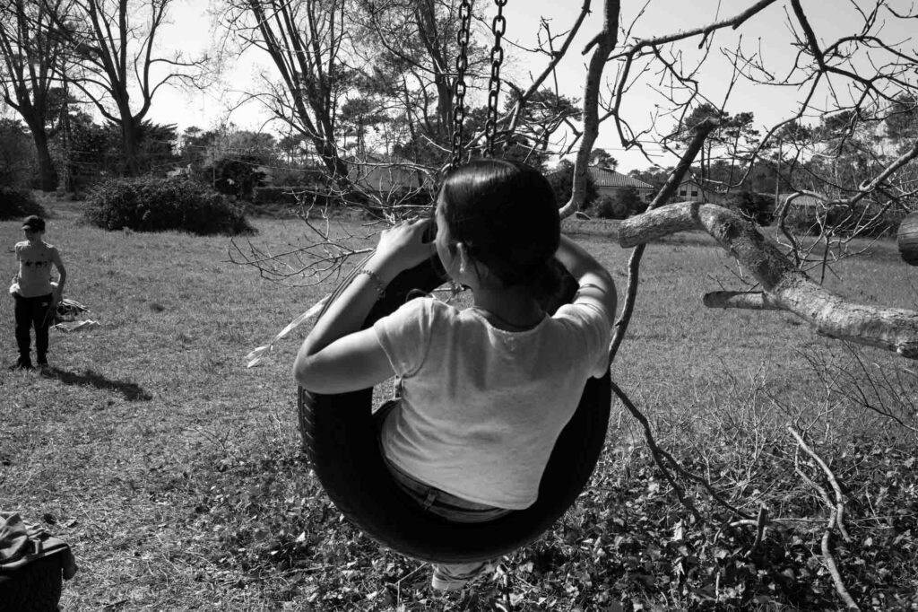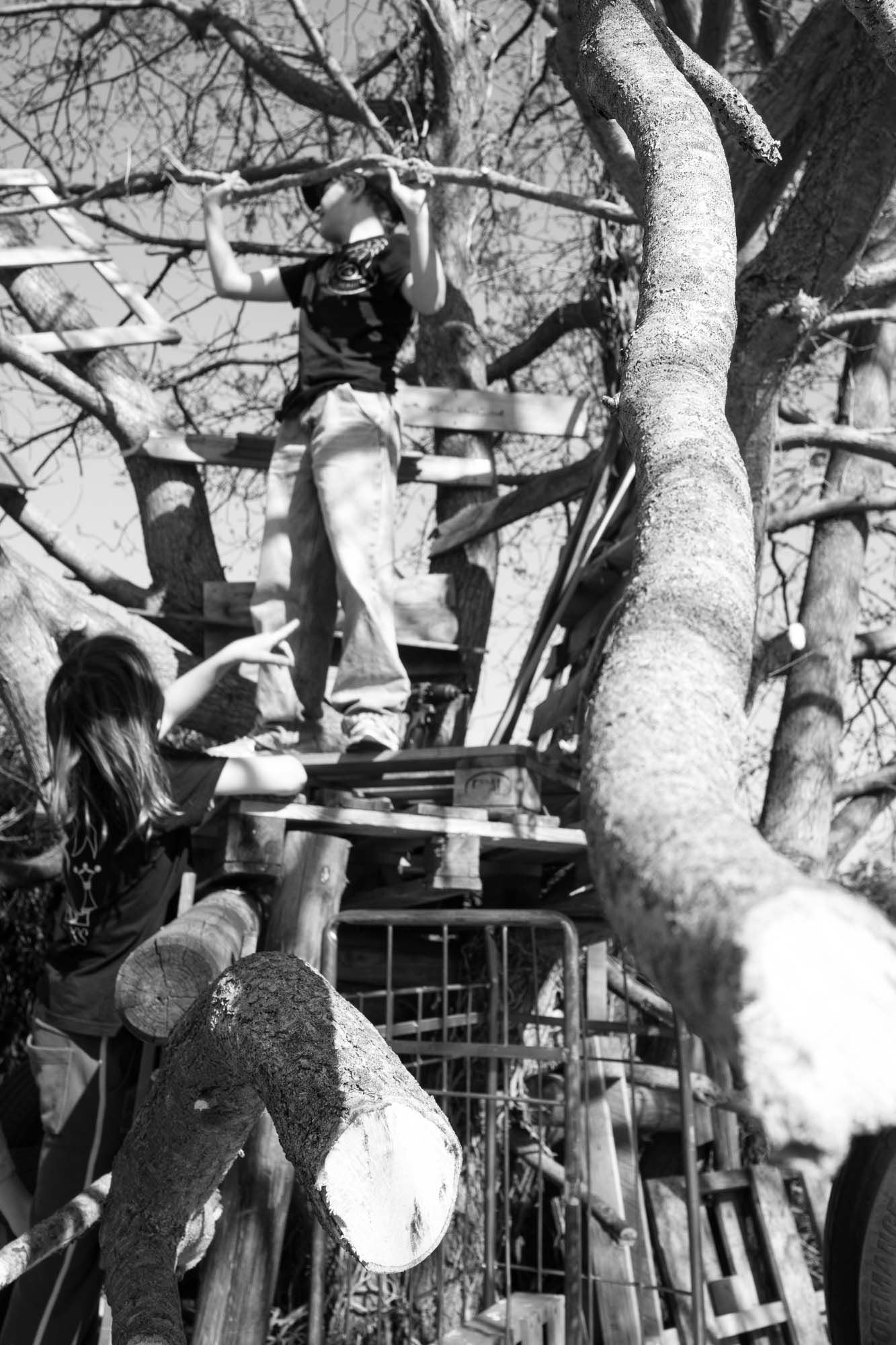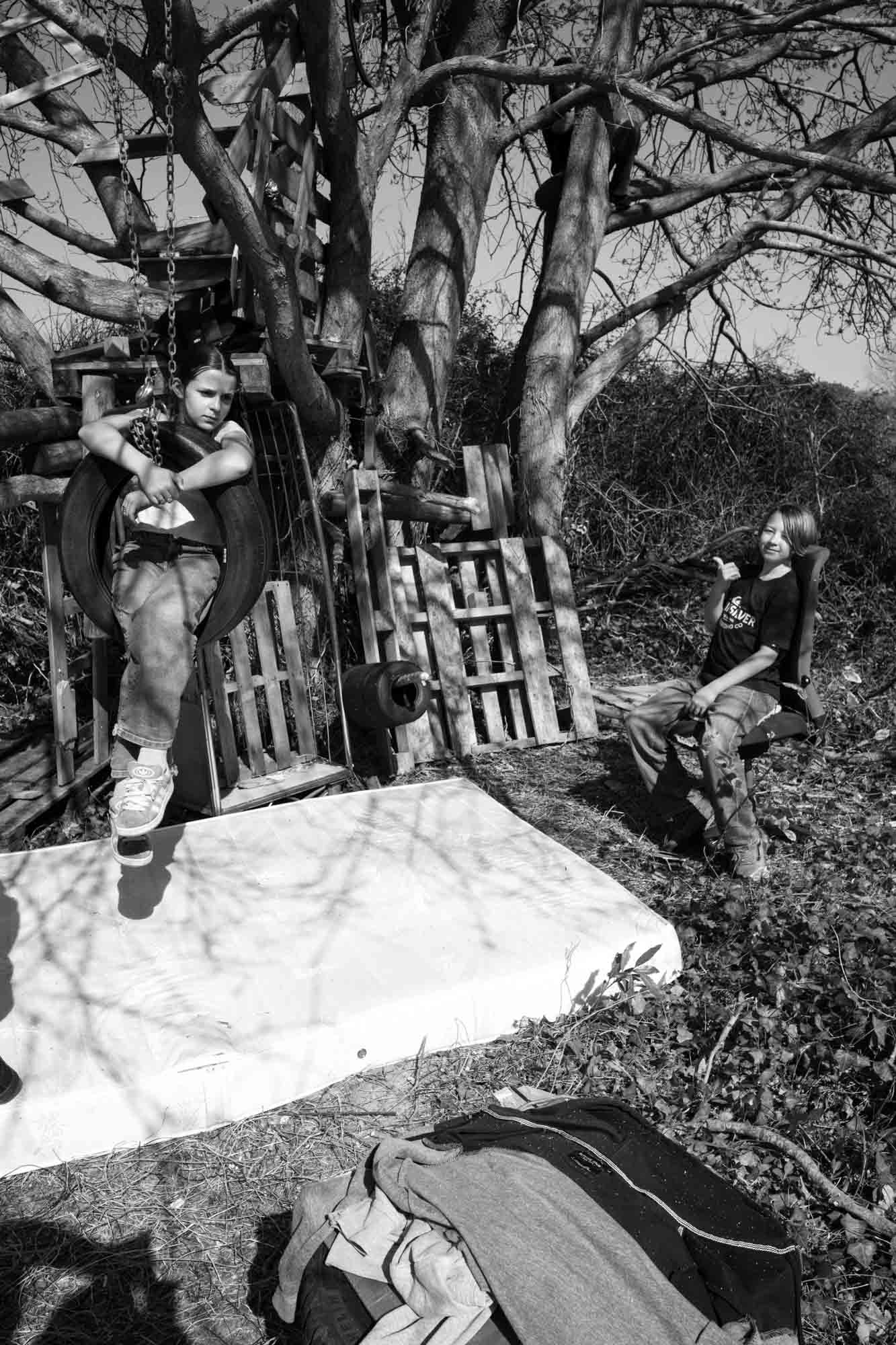 La cabane est en construction. Un étage est déjà posé. Des balançoires bricolées avec des pneus de camion sont en place.