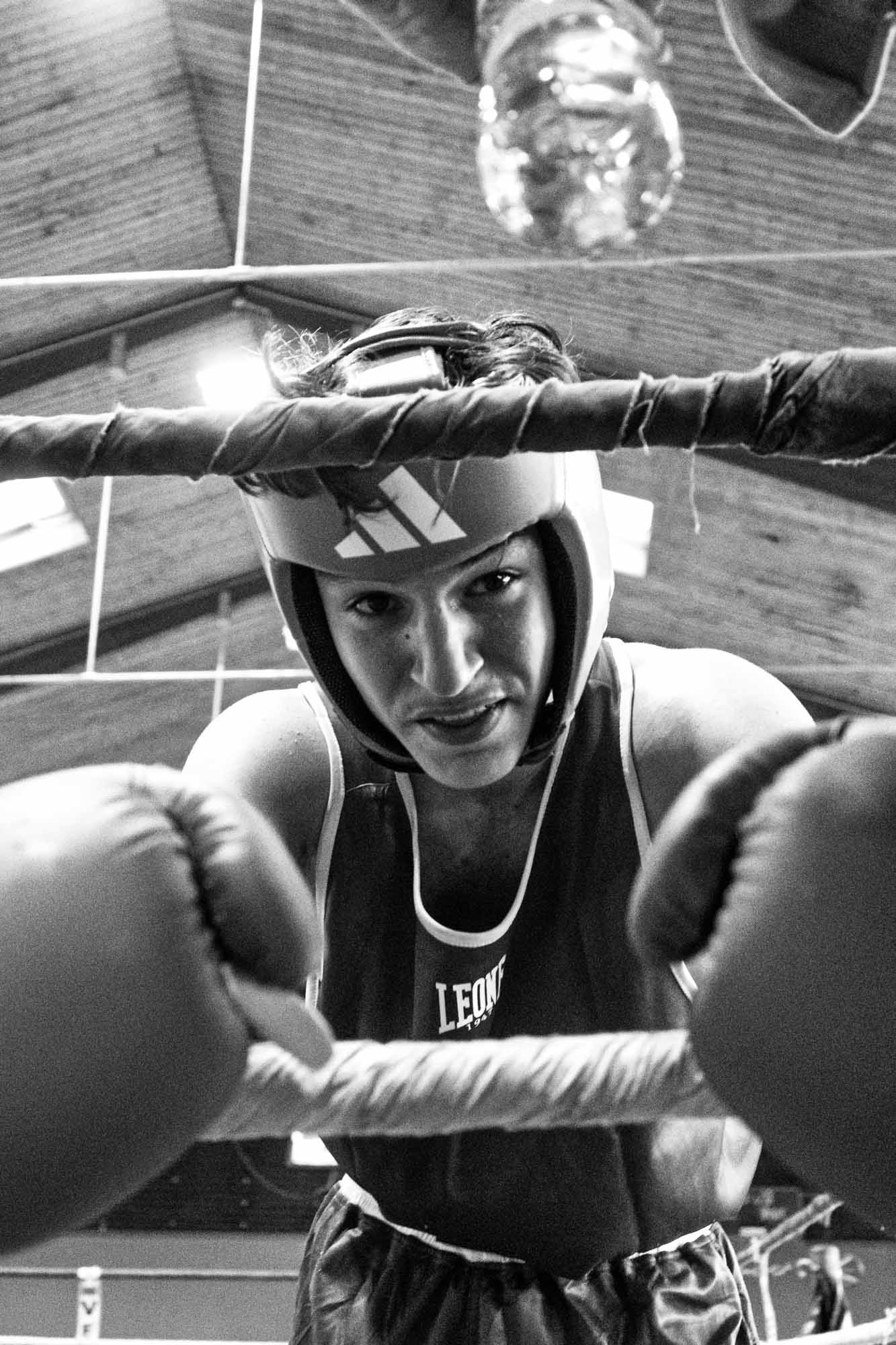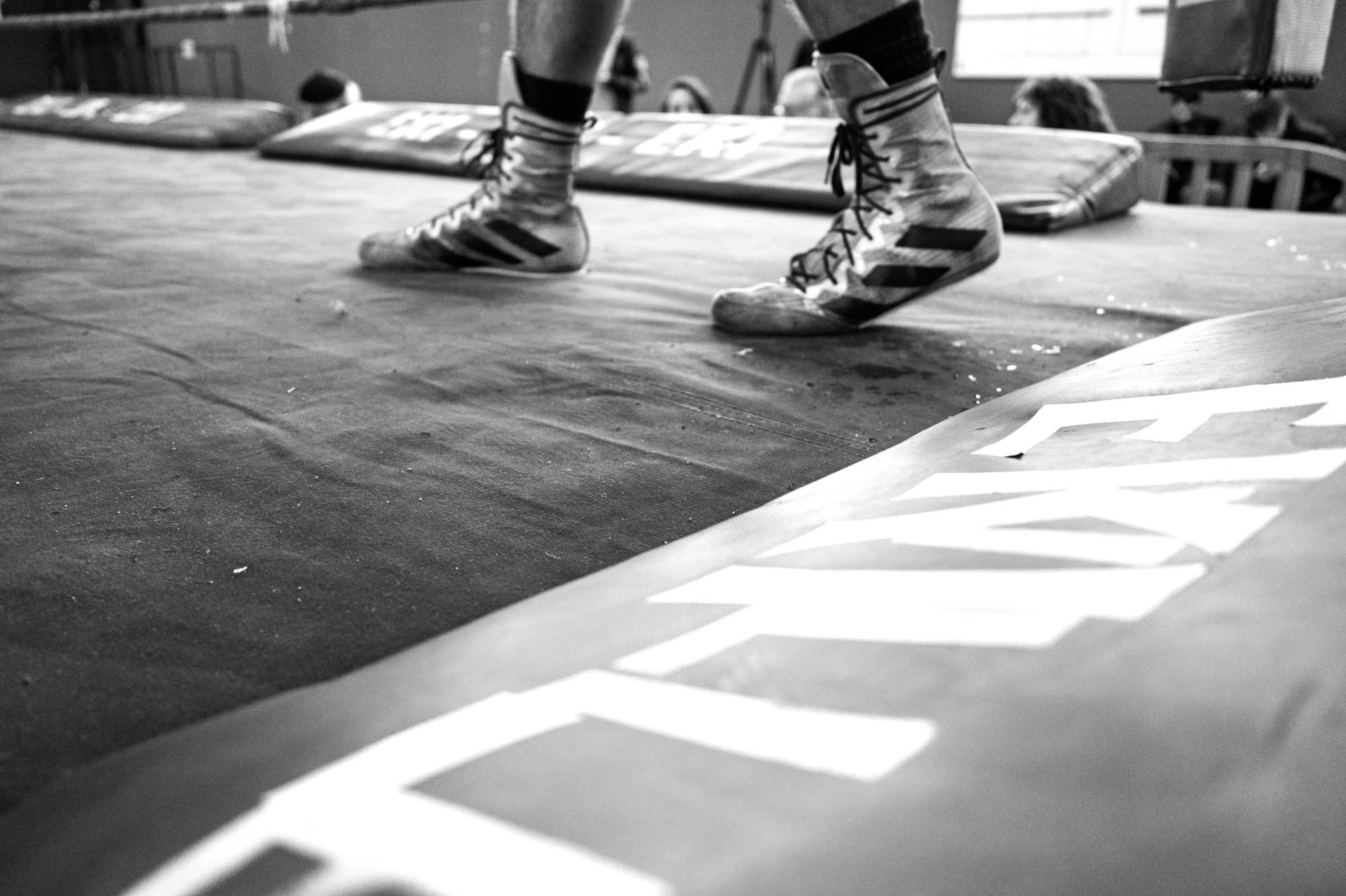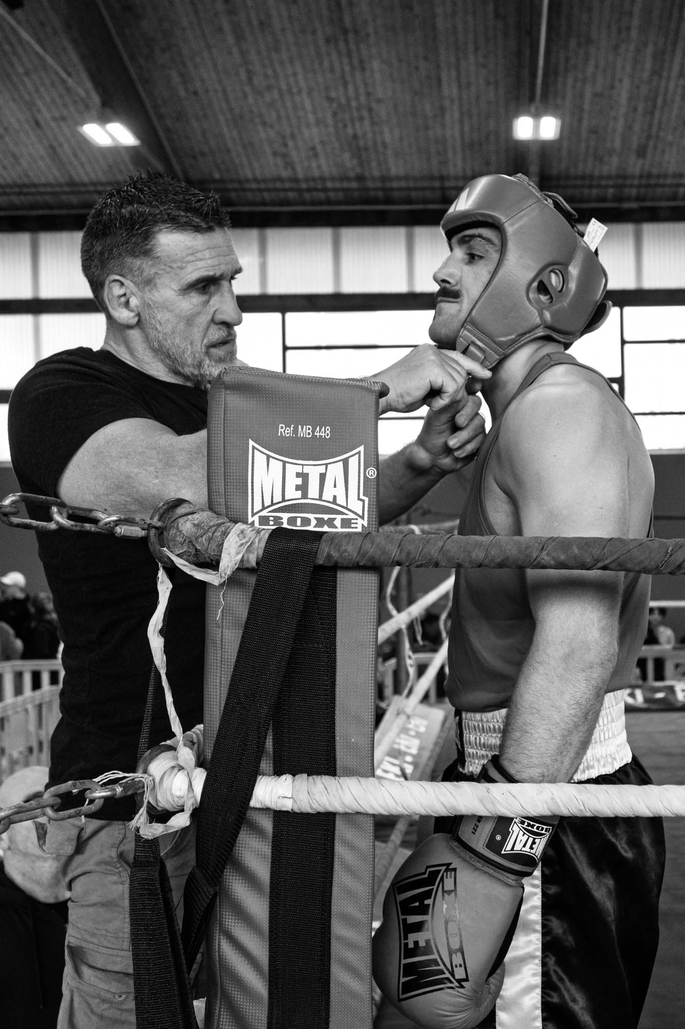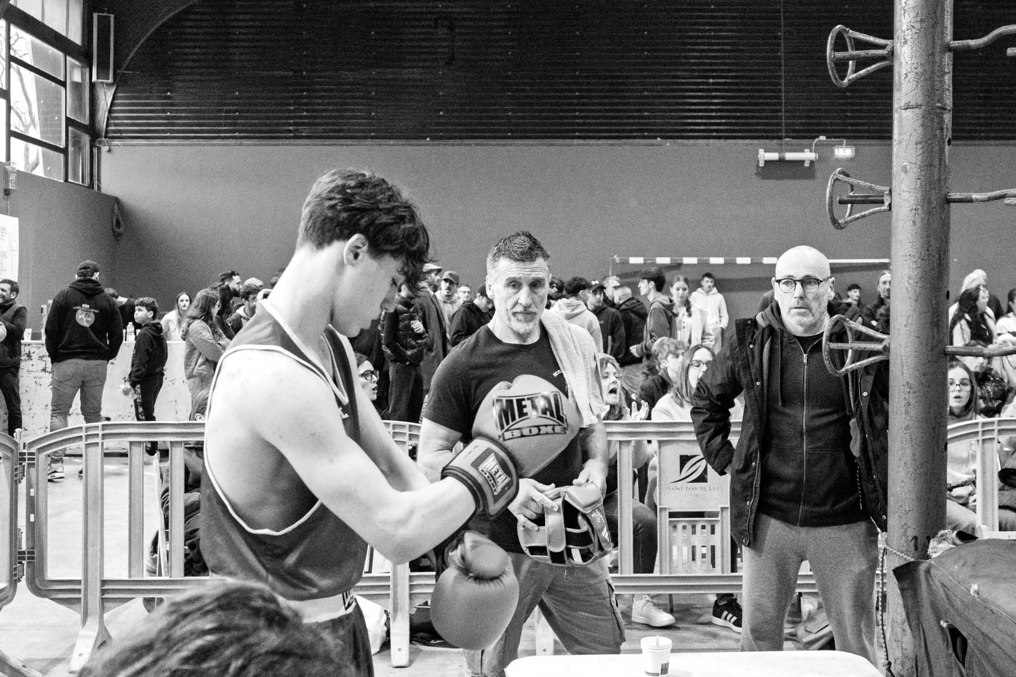 Une fois que t’es chaud, t’attends qu’on t’appelle. Tu regardes ton adversaire au bout de la salle qui se prépare lui aussi. Une fois que c’est le moment, t’avances, et si t’as beaucoup de potes présents on t’applaudit fort. Tu vas dans ton coin (rouge ou bleu). Tu mets tes gants, le casque et le protège-dents avec le coach. L’arbitre vérifie que ce soit aux normes. Tu passes les cordes, l’autre aussi. Sensation étrange, tu vas te battre avec un gars qui pourrait être ton pote. À ce moment-là tu t’en fous, je pense, et tu vas pas jusque-là dans ta tête. Ce que tu veux, c’est pas finir allongé au sol avec un arbitre qui compte et le clan adverse qui ricane.