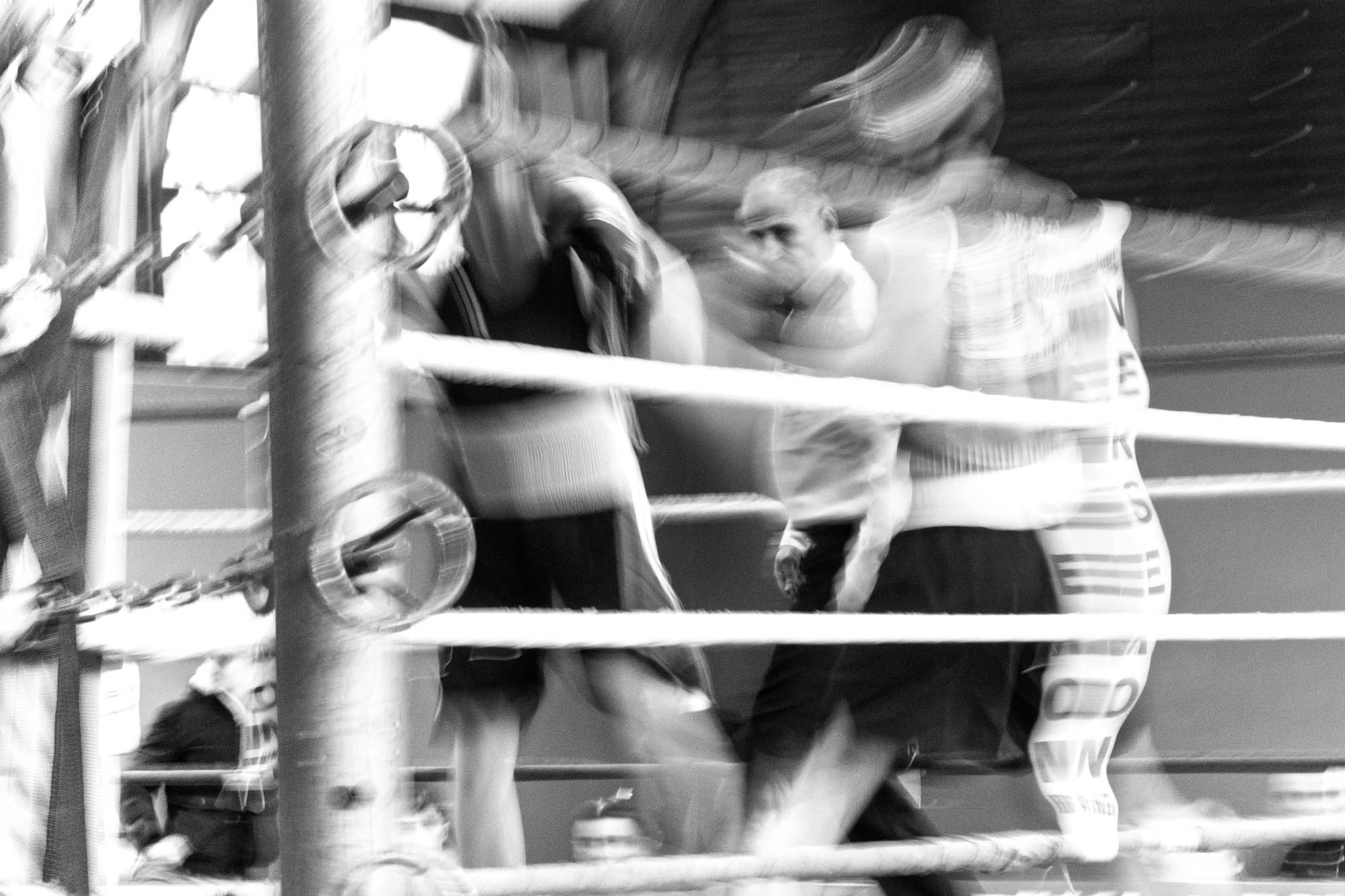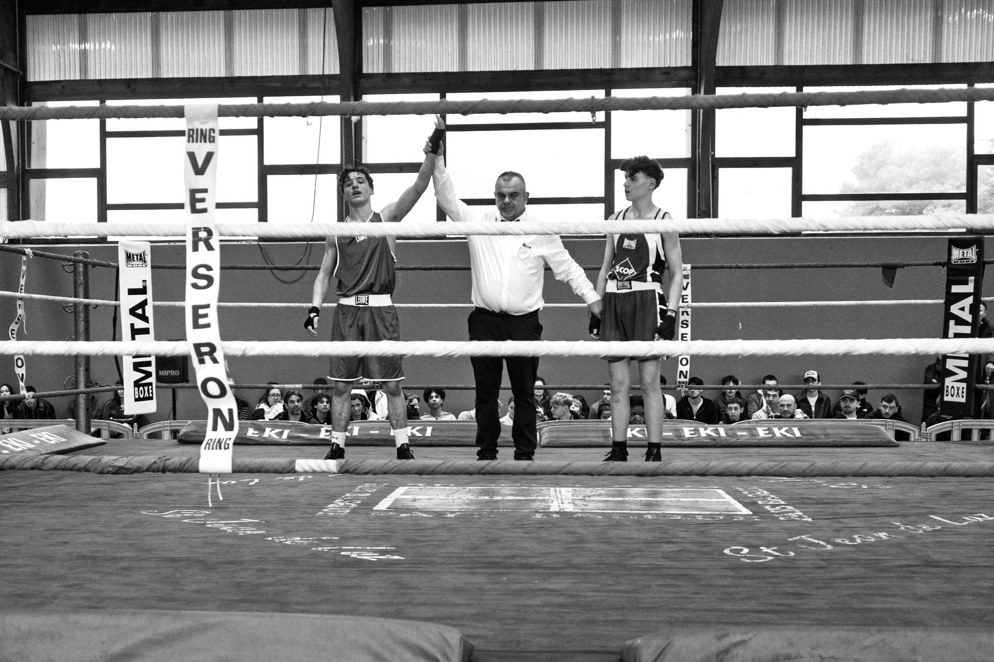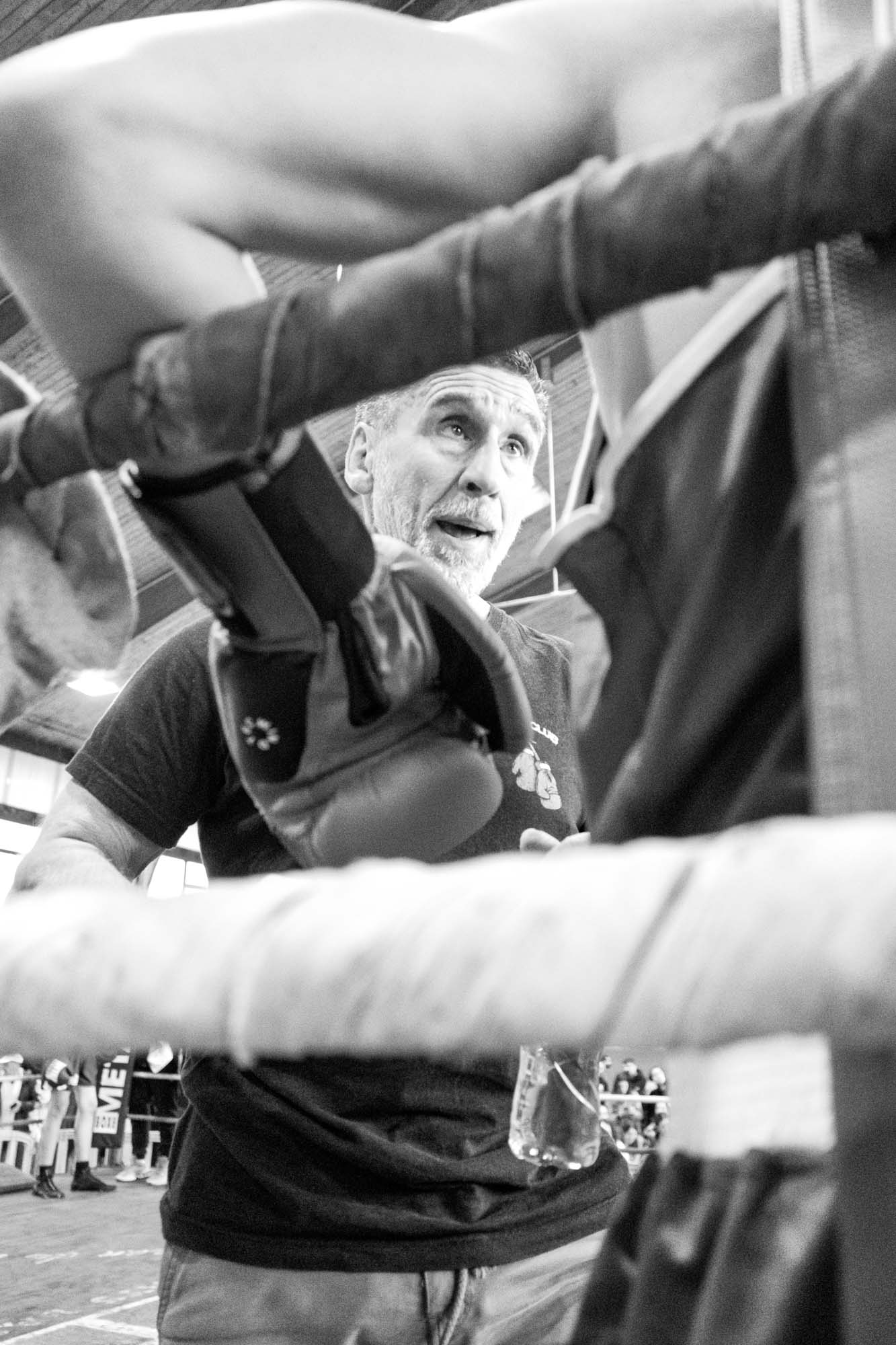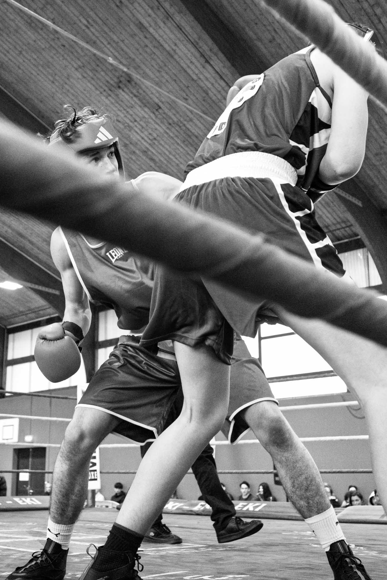 Une fois que t’es chaud, t’attends qu’on t’appelle. Tu regardes ton adversaire au bout de la salle qui se prépare lui aussi. Une fois que c’est le moment, t’avances, et si t’as beaucoup de potes présents on t’applaudit fort. Tu vas dans ton coin (rouge ou bleu). Tu mets tes gants, le casque et le protège-dents avec le coach. L’arbitre vérifie que ce soit aux normes. Tu passes les cordes, l’autre aussi. Sensation étrange, tu vas te battre avec un gars qui pourrait être ton pote. À ce moment-là tu t’en fous, je pense, et tu vas pas jusque-là dans ta tête. Ce que tu veux, c’est pas finir allongé au sol avec un arbitre qui compte et le clan adverse qui ricane.