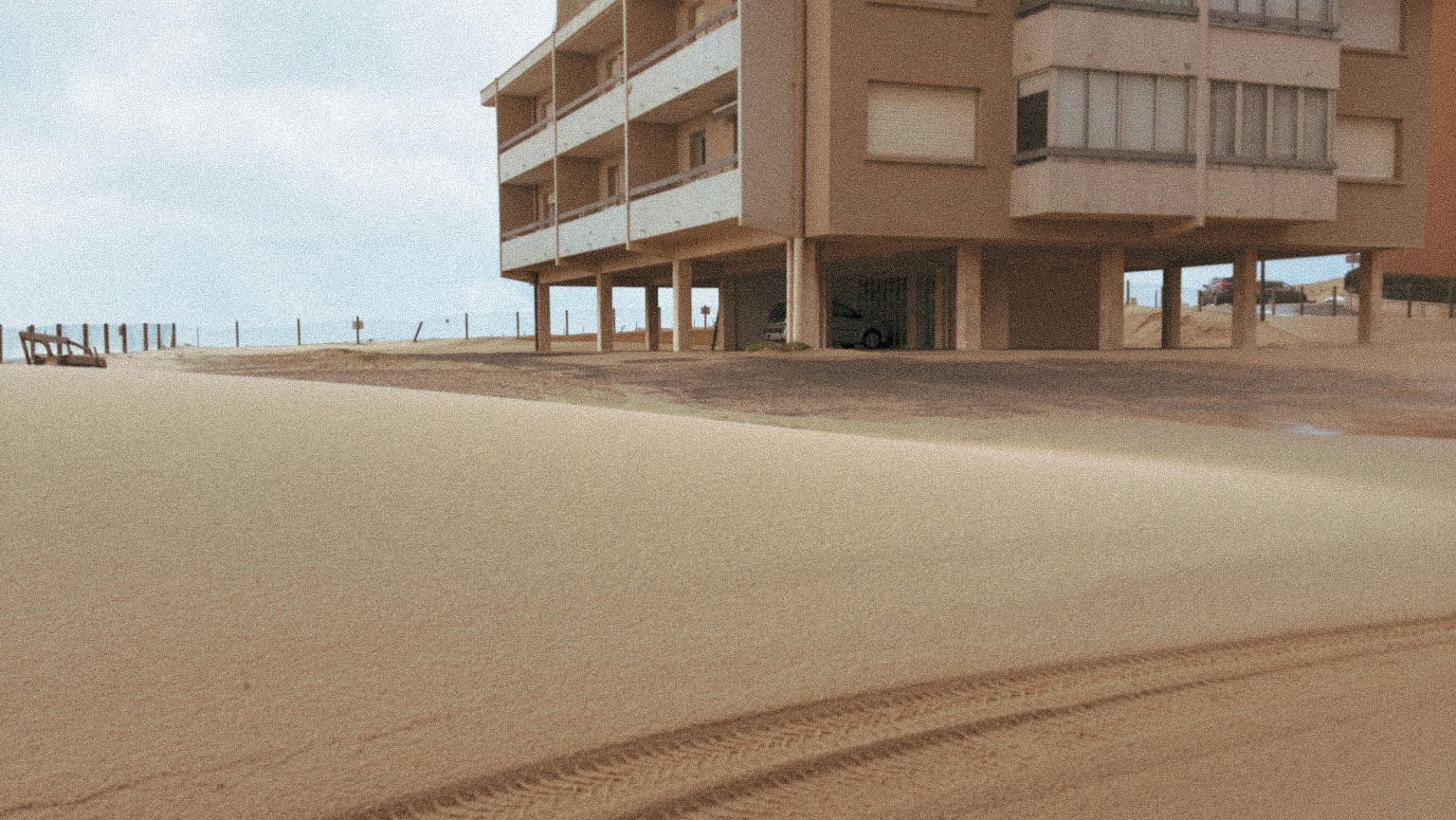 Série photo argentique réalisée à Vieux-Boucau après les coups de vent et les remontées d’océan. Le sable envahit les façades, bloque les accès et recouvre les parkings. La ville se fige, déformée et méconnaissable, sans présence humaine : seulement les traces laissées derrière.