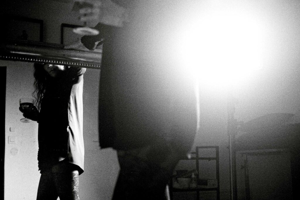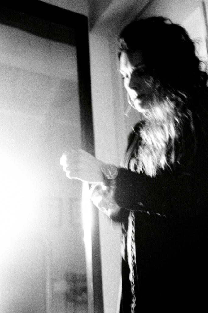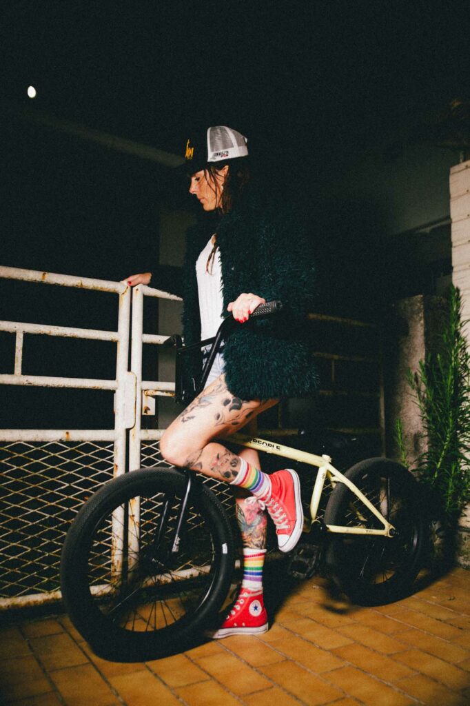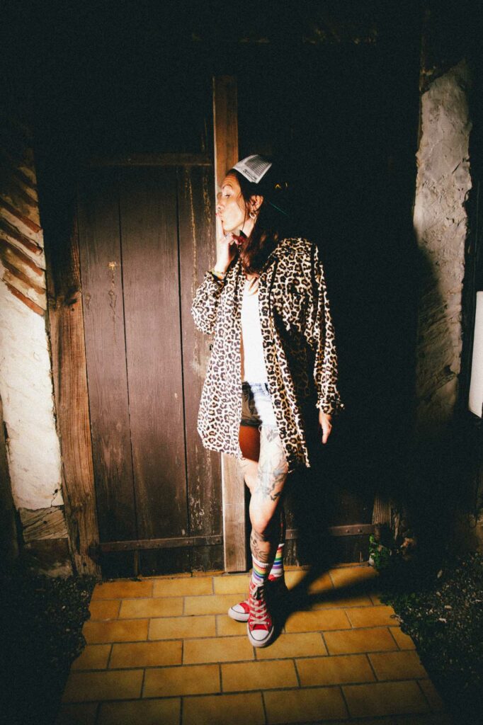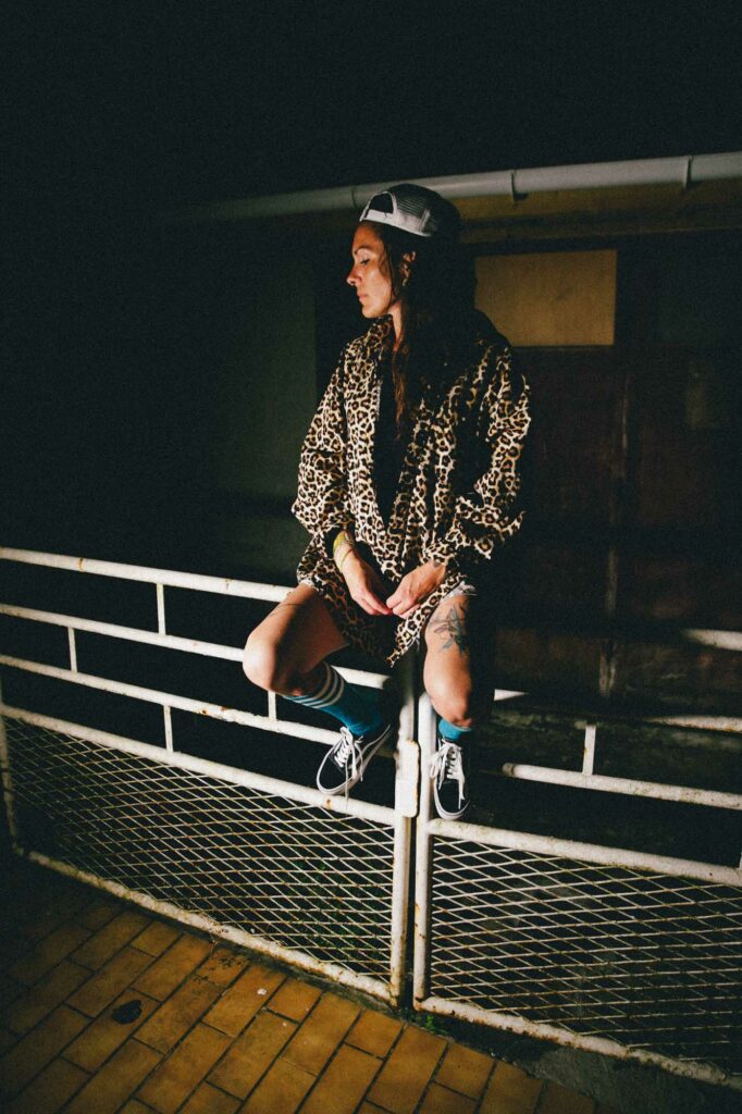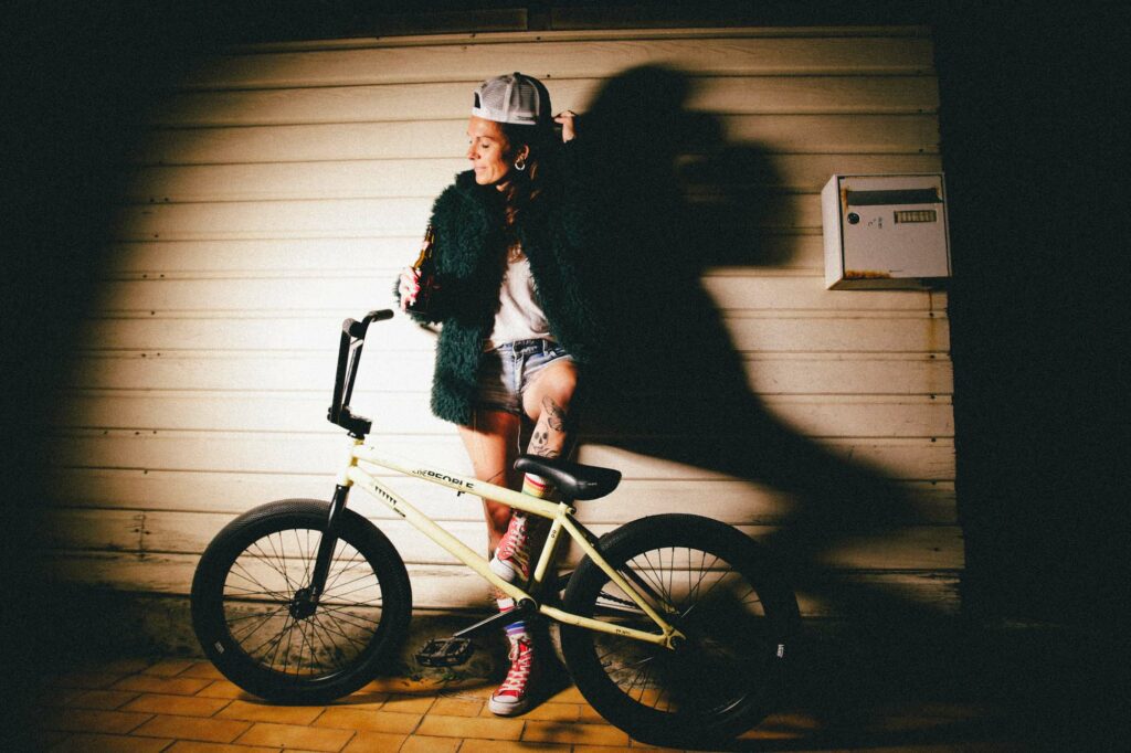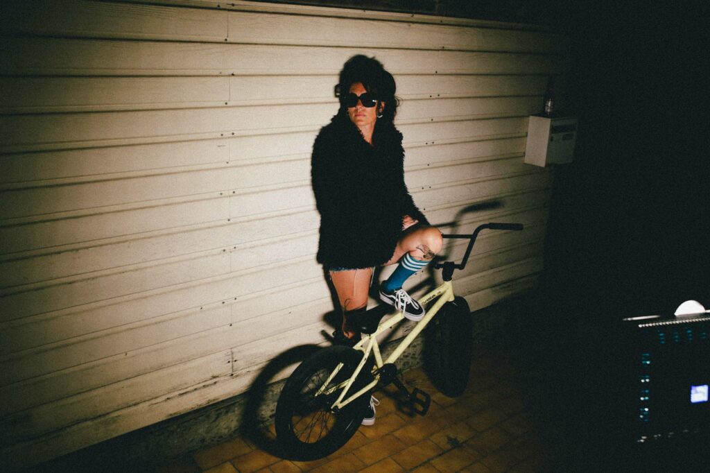 Série argentique west coast. Une façade de garage, un BMX fatigué, une paire de chaussettes rayées. Hélène, debout, assise, indifférente, insolente. Elle a cette manière de flotter dans le décor, comme si tout autour vibrait au ralenti. L’attitude fait tout le reste.