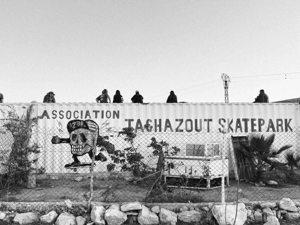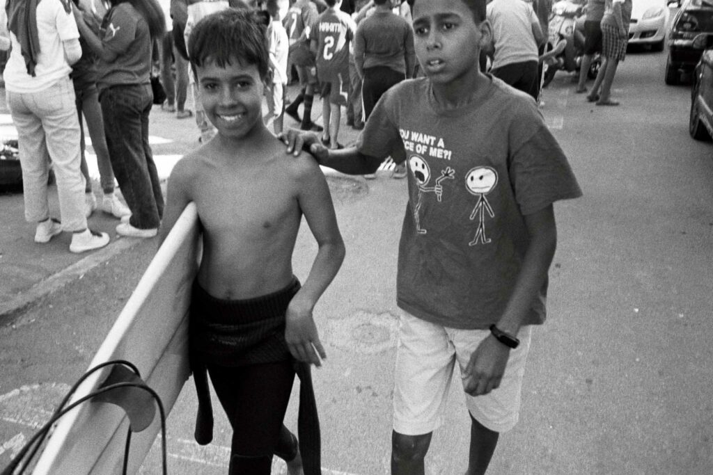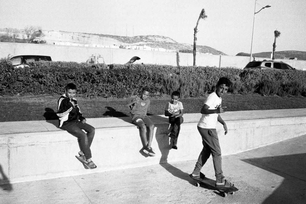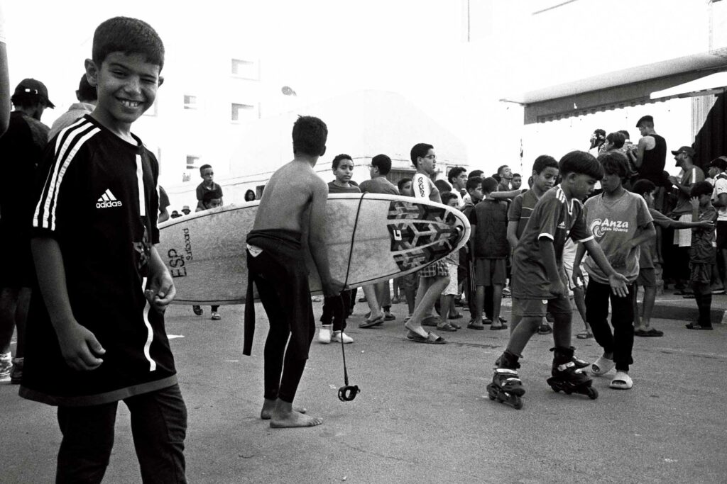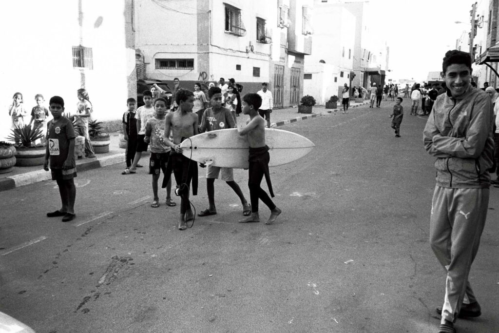 Série argentique du bled (2023). Ici, les mômes règnent sur le trottoir. Planche, bodyboard, baskets rincées : tout leur sert de terrain de jeu.
